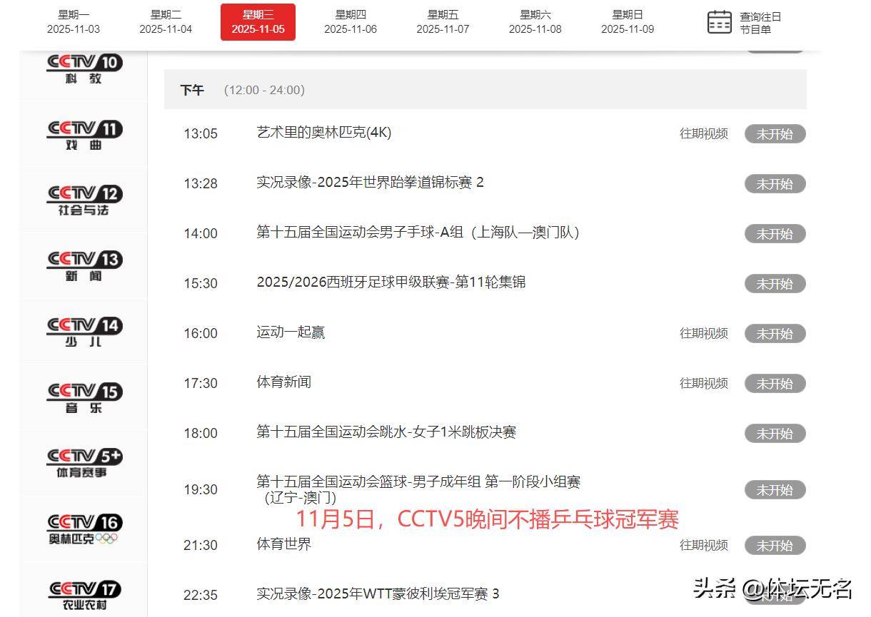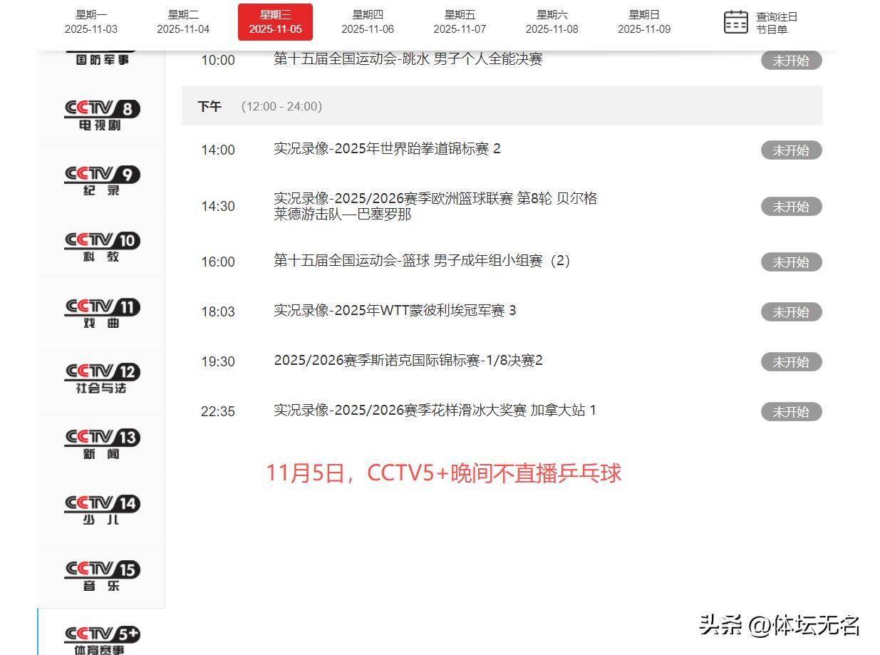 中央5台在11月5日的赛程安排已经出炉,CCTV5晚间19点30直播的是全运会篮球比赛,CCTV5 在19点30直播斯诺克,所以央视不直播WTT德国法兰克福冠军赛,主要原因是国乒没有参加!