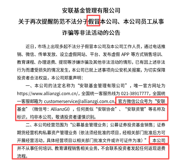 另外,安联基金也提醒投资者识别,其官方微信公众号为“安联基金”,任何类似“安联协会”“安联资管”等名称的账号均非其公司官方账号(注:安联集团下有安联资管,是安联基金的兄弟公司,有同名网站)。
