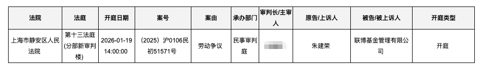 联博基金是另一家被推上被告席的外资公募。其前副总经理朱建荣因“个人原因”离职4个月后,即将与“老东家”对簿公堂,案由同为“劳动争议”。
