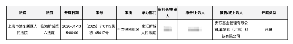 原告张某以“不当得利纠纷”为由起诉安联基金,同时被起诉的还有菲尔莱(北京)科技有限公司(以下简称菲尔莱),案件暂定于1月13日在上海开庭。