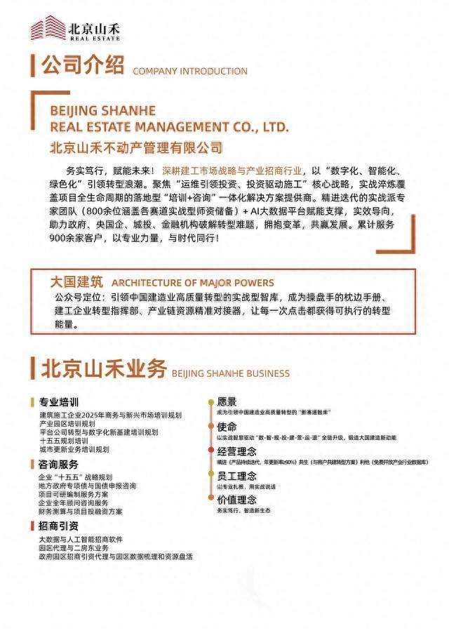 北京山禾不动产管理有限公司成立十年来,始终致力于建工行业发展趋势、市场拓展模式创新、地方政府专项债券发行策划咨询、EOD模式投融资、城市更新、城中村改造、保障房建设、平急两用工程咨询与培训服务,是国内为数不多为建工行业持续输出“投、建、营、运”全过程咨询的不动产管理公司,公司同时管理运营长三角最大的招商引资中介公司与共享厂房资源,兼营地方政府、企事业园区产业导入与招商引资业务服务。公司及合伙企业具备土地评估中介机构资信等级证书A级证书、城市规划咨询甲级资质、工程咨询资信甲级、工程造价咨询甲级资质。