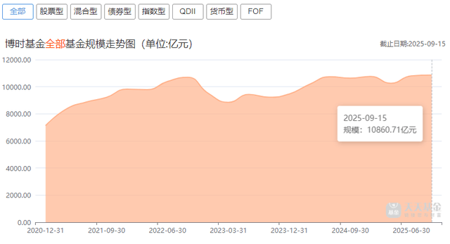 天天基金网显示,截至9月15日,博时基金公募总规模10860.71亿元,较2024年末的10755.96亿元增长不足120亿元。